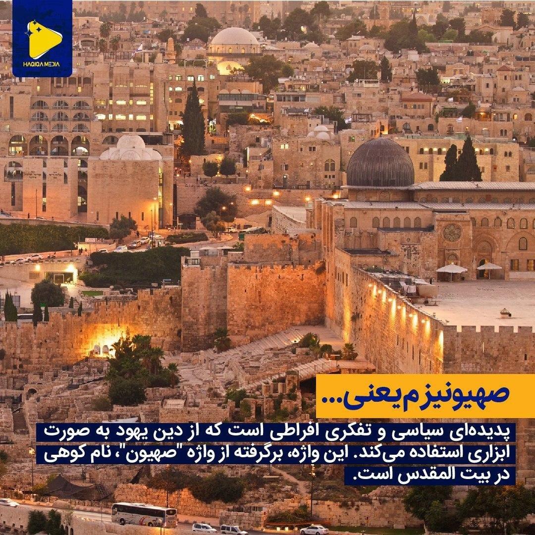 صهیونیزم یعنی… پدیدهای سیاسی و تفکری افراطی است که از دین یهود به صورت ابزاری استفاده میکند. این واژه، برگرفته از واژه “صهیون”، نام کوهی در #بیت_المقدس است.