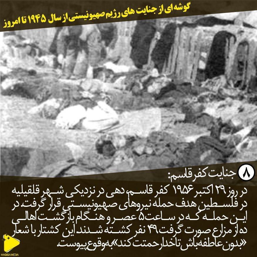 گوشهای از جنایتهای رژیم صهیونیستی از سال 1945 تا امروز: