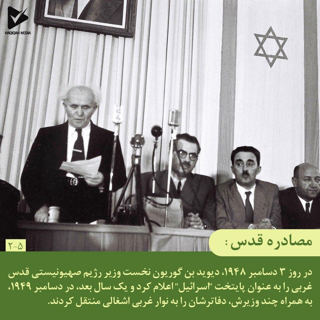 مصادره قدس: در روز 3 دسامبر 1948، دیوید بن گوریون نخست وزیر رژیم صهیونیستی قدس غربی را به عنوان پایتخت “اسرائیل” اعلام کرد و یک سال بعد، در دسامبر 1949، به همراه چند وزیرش، دفاترشان را به نوار غربی اشغالی منتقل کردند.