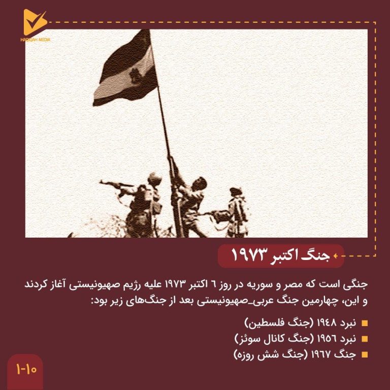 جنگ اکتبر 1973 جنگی است که مصر و سوریه در روز 6 اکتبر 1973 علیه رژیم صهیونیستی آغاز کردند و این، چهارمین جنگ عربی – صهیونیستی بعد از جنگهای زیر بود: – نبرد 1948 (جنگ فلسطین) – نبرد 1956 (جنگ کانال سوئز) – جنگ 1967 (جنگ شش روزه)