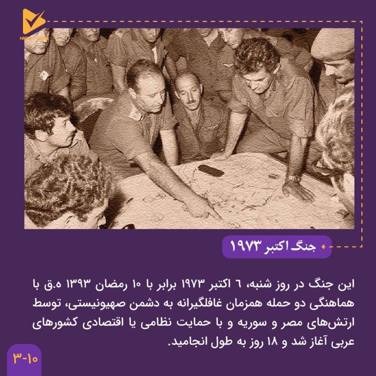 جنگ اکتبر 1973: این جنگ در روز شنبه، 6 اکتبر 1973 برابر با 10 رمضان 1393 ه.ق آغاز شد با هماهنگی دو حمله همزمان غافلگیرانه به دشمن صهیونیستی، توسط ارتشهای مصر و سوریه و با حمایت نظامی یا اقتصادی کشورهای عربی آغاز شد و 18 روز به طول انجامید.