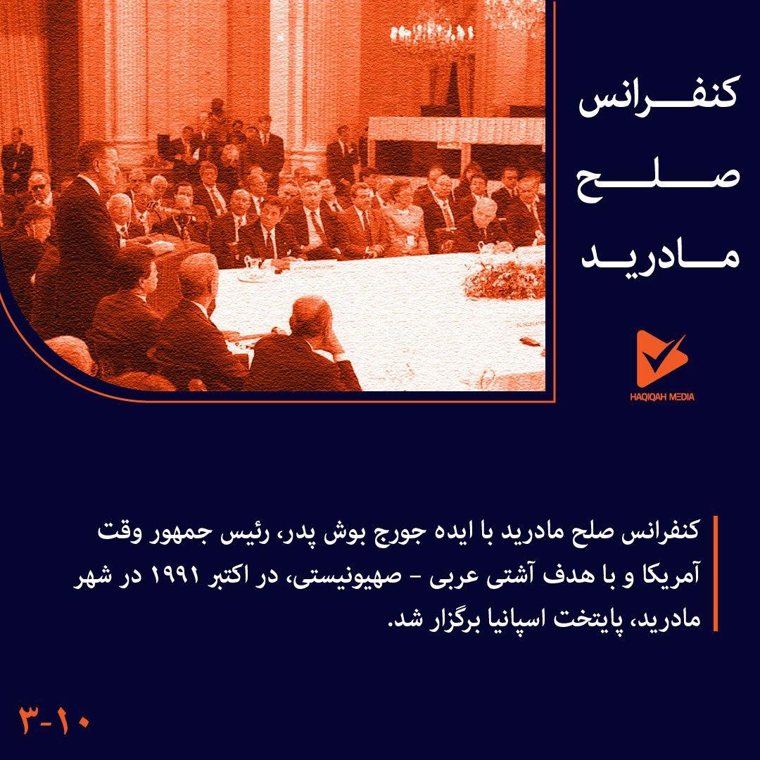 کنفرانس صلح مادرید کنفرانس صلح مادرید با ایده جورج بوش پدر، رئیس جمهور وقت آمریکا و با هدف آشتی عربی – صهیونیستی، در اکتبر 1991 در شهر مادرید، پایتخت اسپانیا برگزار شد.