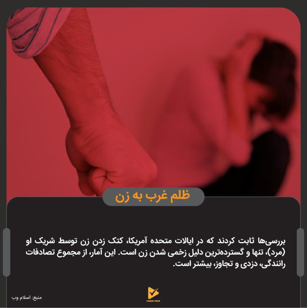 بررسیها ثابت کردند که در ایالات متحده آمریکا، کتک زدن زن توسط شریک او (مرد)، تنها و گستردهترین دلیل زخمی شدن زن است. این آمار، از مجموع تصادفات رانندگی، دزدی و تجاوز، بیشتر است. منبع: اسلام وب