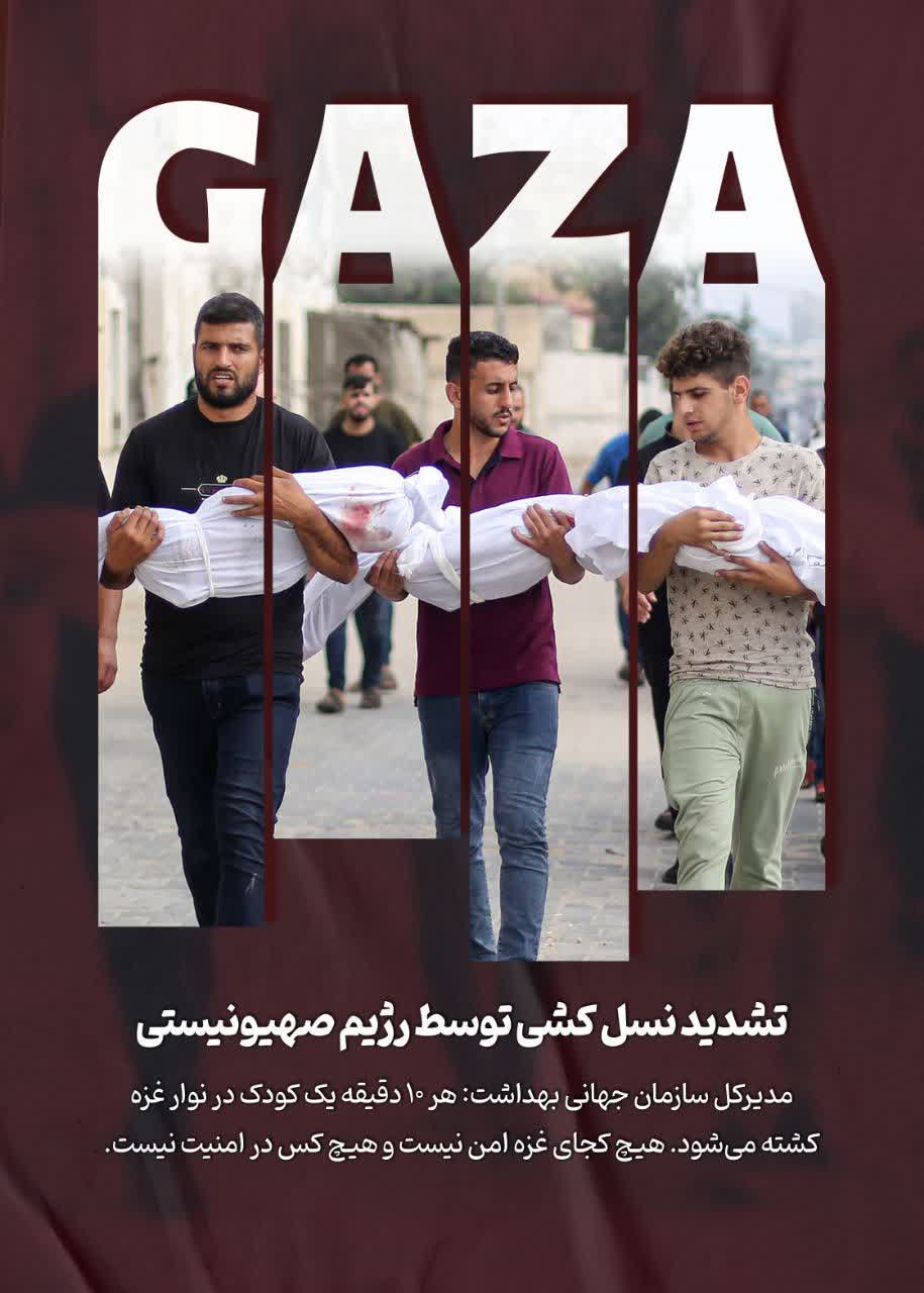مدیر کل سازمان جهانی بهداشت: هر ۱۰ دقیقه یک کودک در نوار غزه کشته می شود. هیچ کجای غزه آمن نیست و هیچ کس در امنیت نیست.